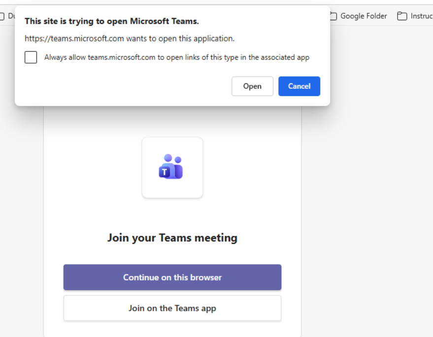 🗓️ Important dates & application deadlinesBelow are directions if you have not logged into a Teams Meeting before.When you click on the link, You will see the first image below. Select "Open" in the pop-up box and then "Continue on this Browser" on the button below. You should then see the 2nd image in this email.
